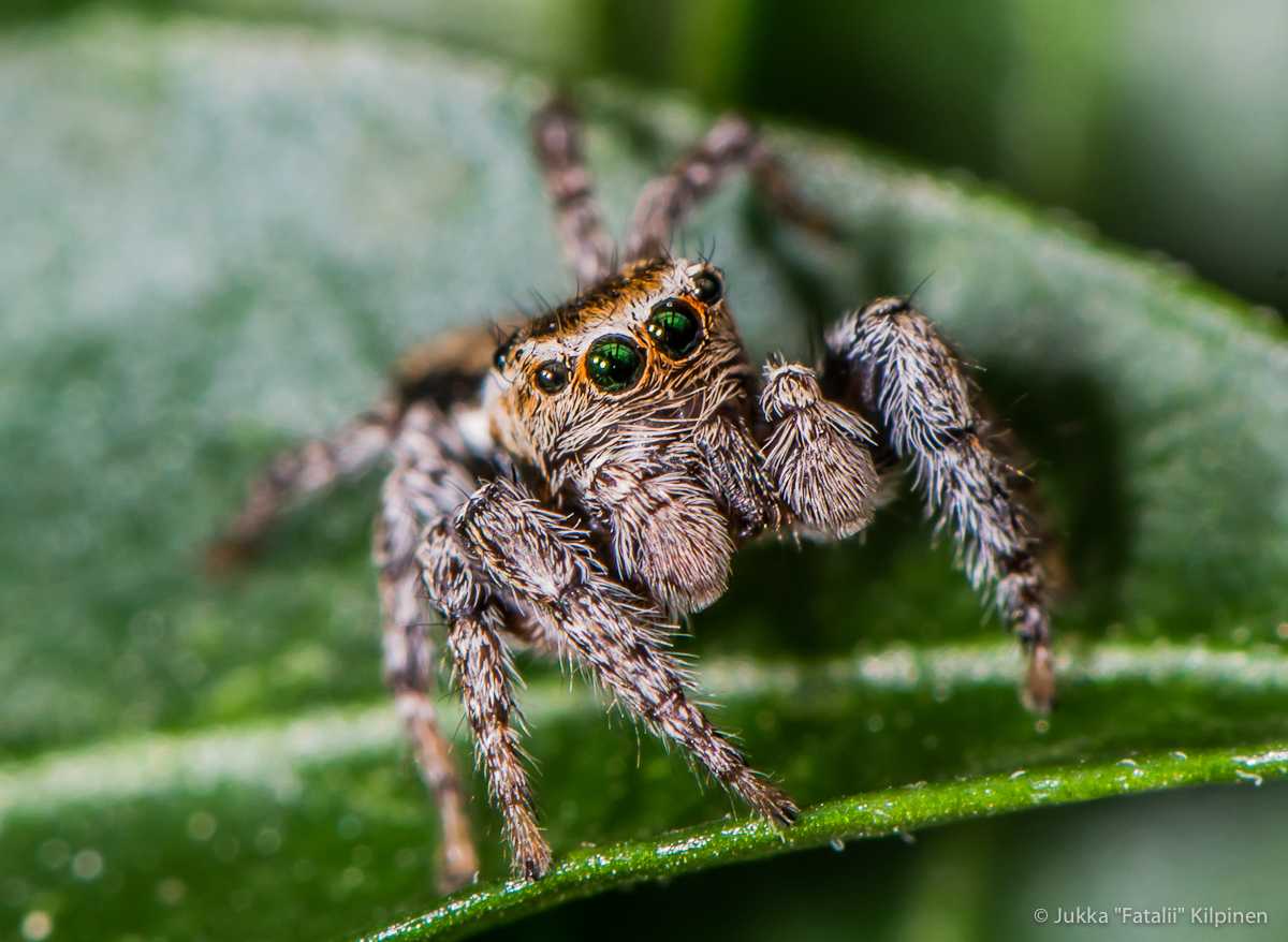 Jump spider on Medusa plant. These are very sympatic creatures spinning their heads around looking for places where to jump. They also scratch themselves with legs like dogs. Very funny. :)