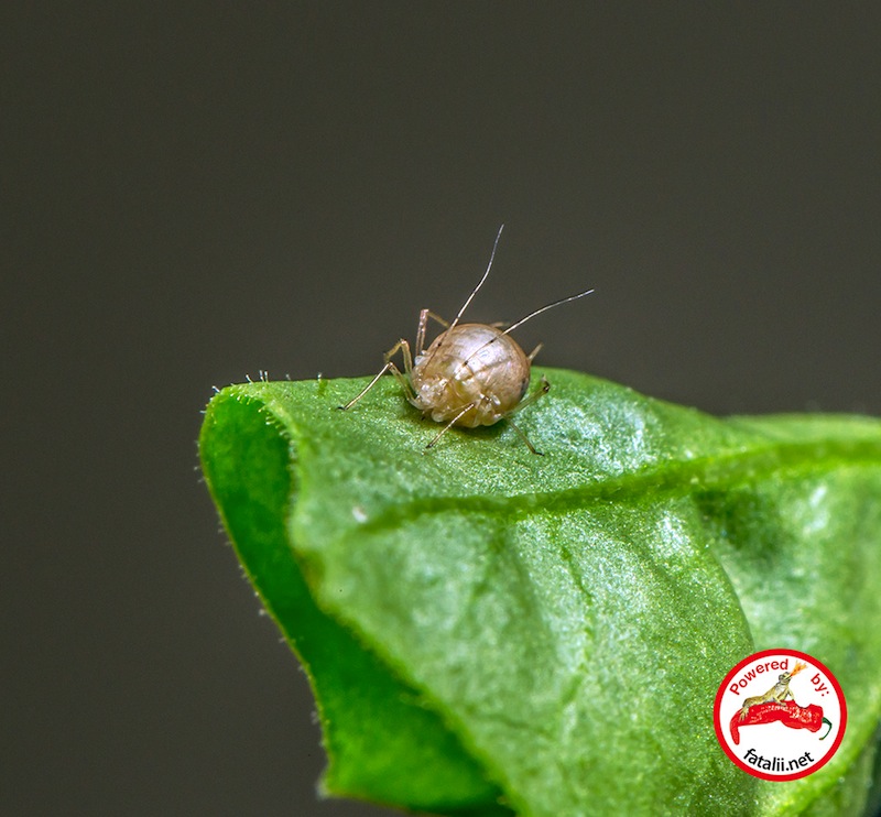 This aphid is actually a dead mummy. Aphidius colemani has laid it's egg inside a living aphid. The hatched larvae has eaten the living aphid from inside! Very barbaric and effective. It seems that Aphidius colemani has overwintered in my greenhouse and attacked immediately when they spotted some aphids.