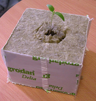 Seedling in a small rockwool cube transplanted inside the large cube. The large cube can now be transplanted into hydroponic system like waterfarm etc.